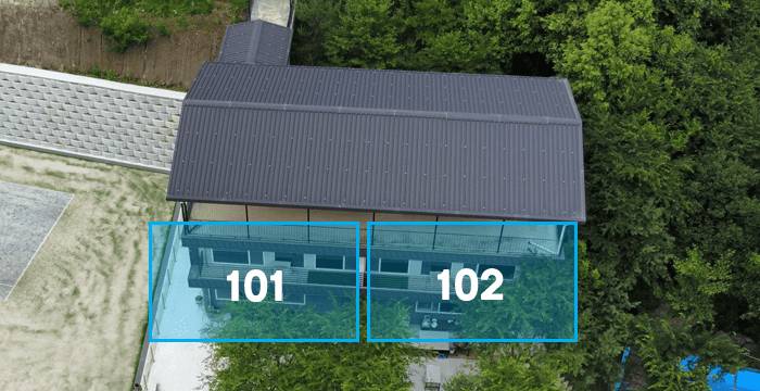 숙소 건물은 한개의 하우스에 정확히 반이 나뉜 2호실 구조이며